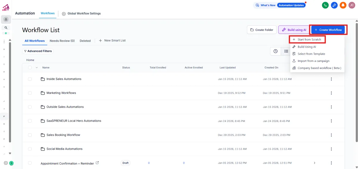 2.Click Create Workflow > Select Start from scratch