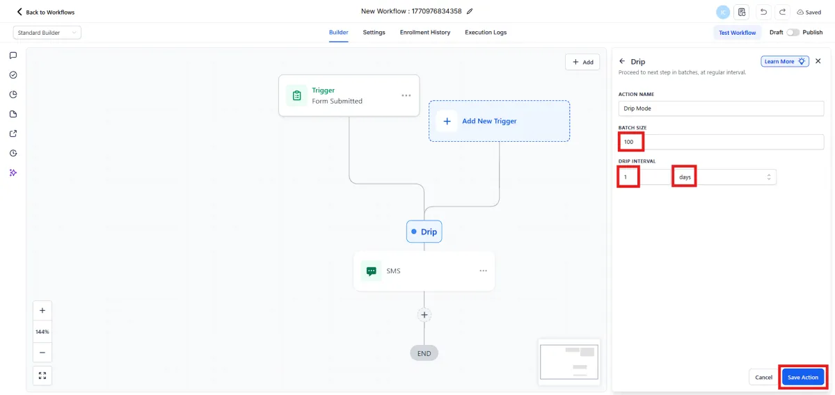 7.Set your batch size to 100. Choose the drip interval as every 1 day. Click Save Action.
