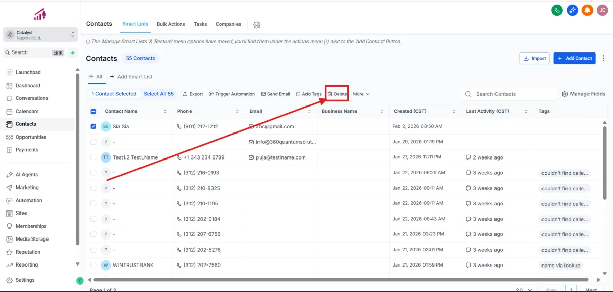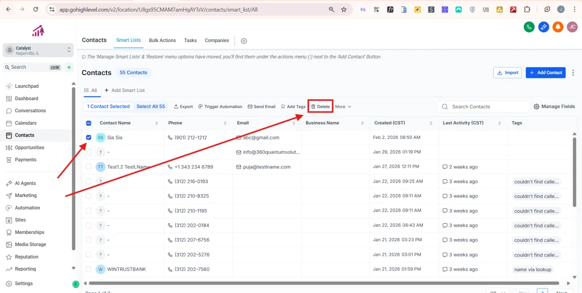 Select the contact you would like to delete using the checkbox to the left of the name. Then click the Delete button